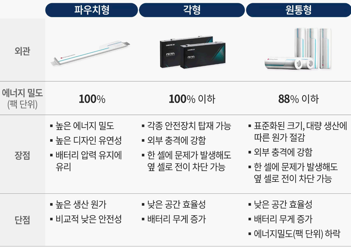 - 내부 공간 활용도가 높아 전기차, 에너지 저장 시스템(ESS)에 사용됨.